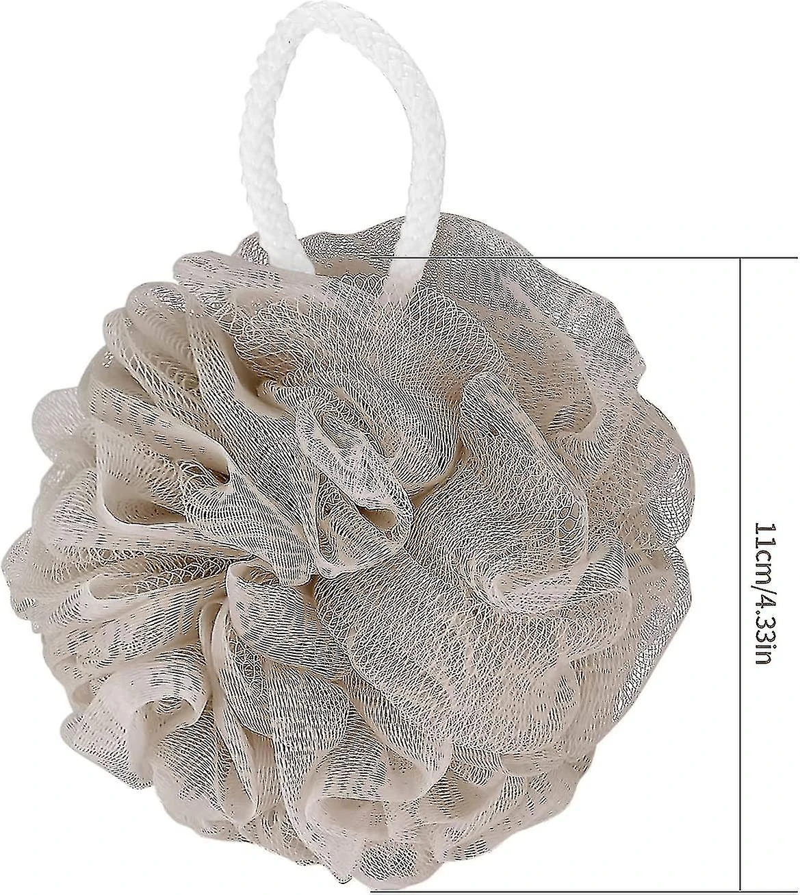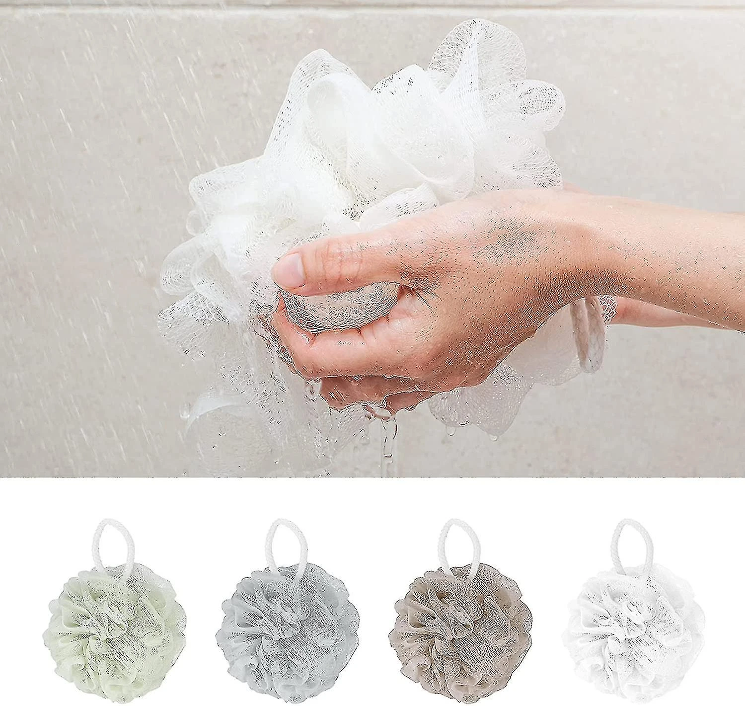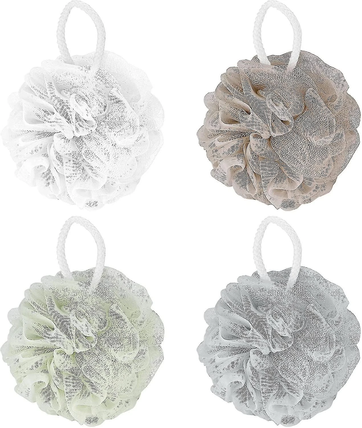 What You Will GetYou will get 4 pcs mesh bath balls in 4 colors, which has dense layers of mesh, providing a nice scrub without being harsh on the skin, and can be compacted for small size, great and convenient for carrying. .