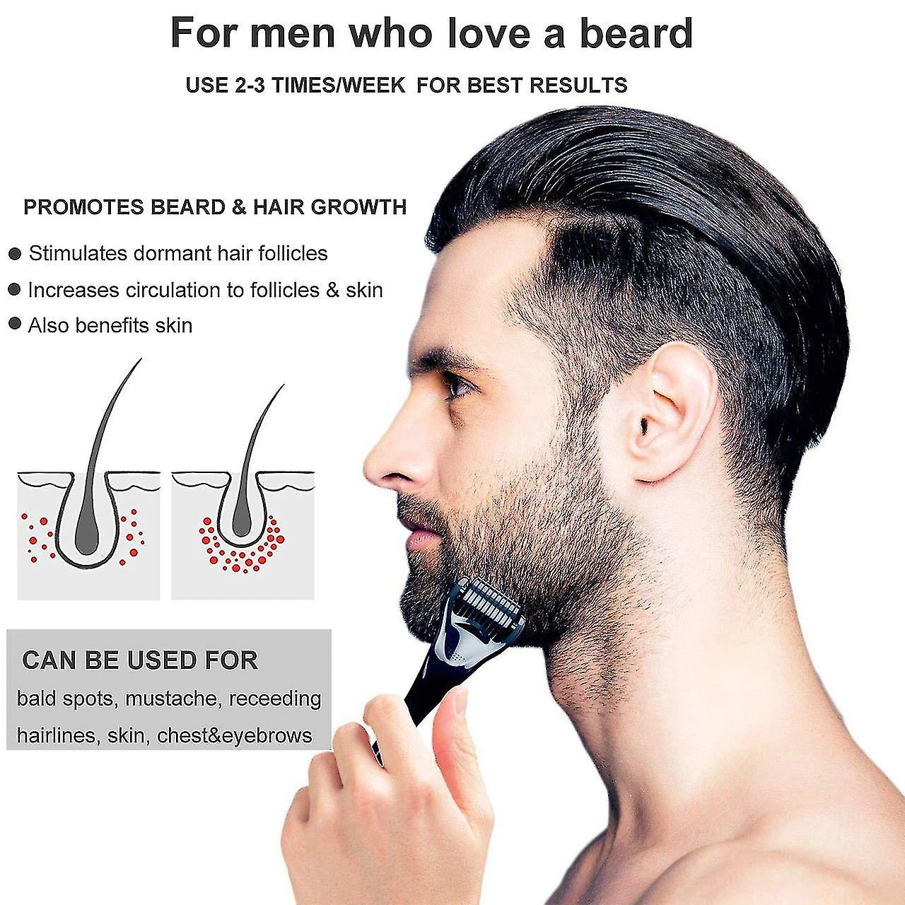 Healthy skin Our beard growth kit increases the firmness and elasticity of the skin, eliminates irritation, heals, nourishes the skin cells as well as the hairline of beard and moustache. In addition, you can use our derma roller yourself for face, neck, scalp and other body parts.