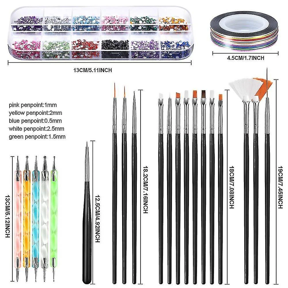 Great starter kit for nail art tools: Acrylic nail Accessories kit with everything including 15pcs precision nail brush+12 sheets designer nail foil + 10 rollers skinny striping tape + 24 cases pretty little stones+5pcs Mixed sized dotting tools +12 colors butterflies nail sequins